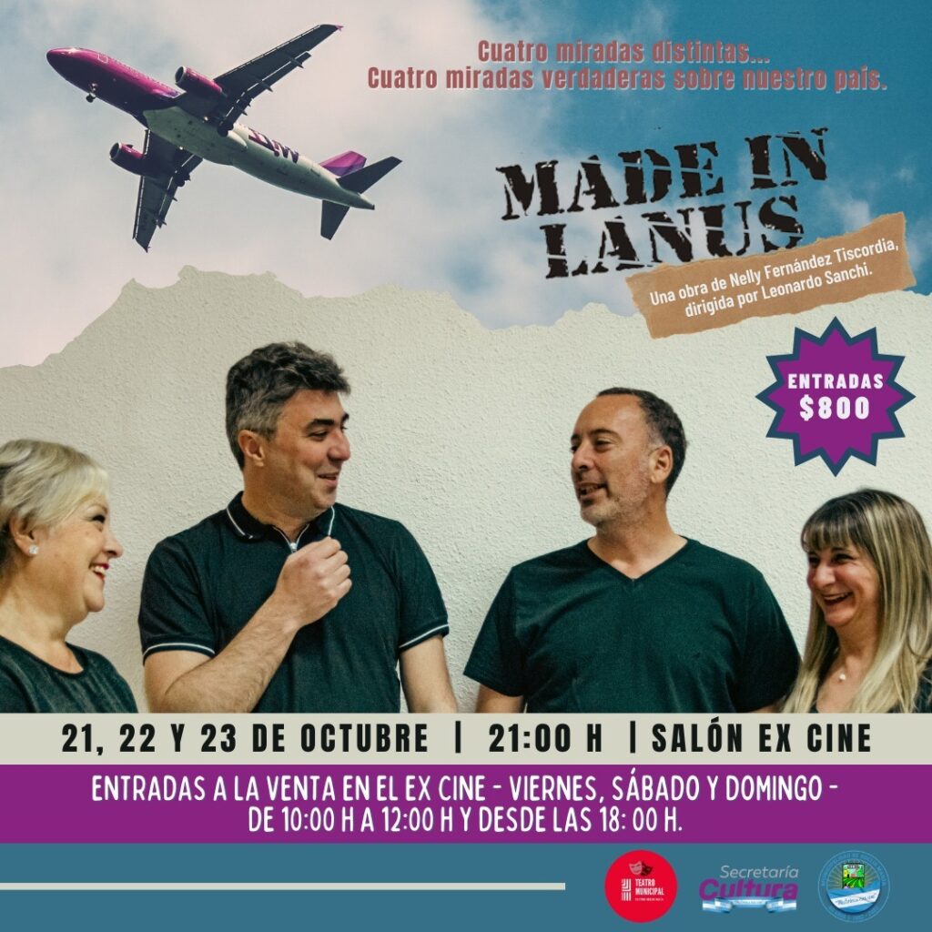 Llega al Teatro Municipal de Adelia María la obra de teatro «Made in Lanus», cuatro miradas distintas y verdaderas sobre nuestro país, espectáculo de Nelly Fernández Tiscordia y dirigida por Leonardo Sanchi.