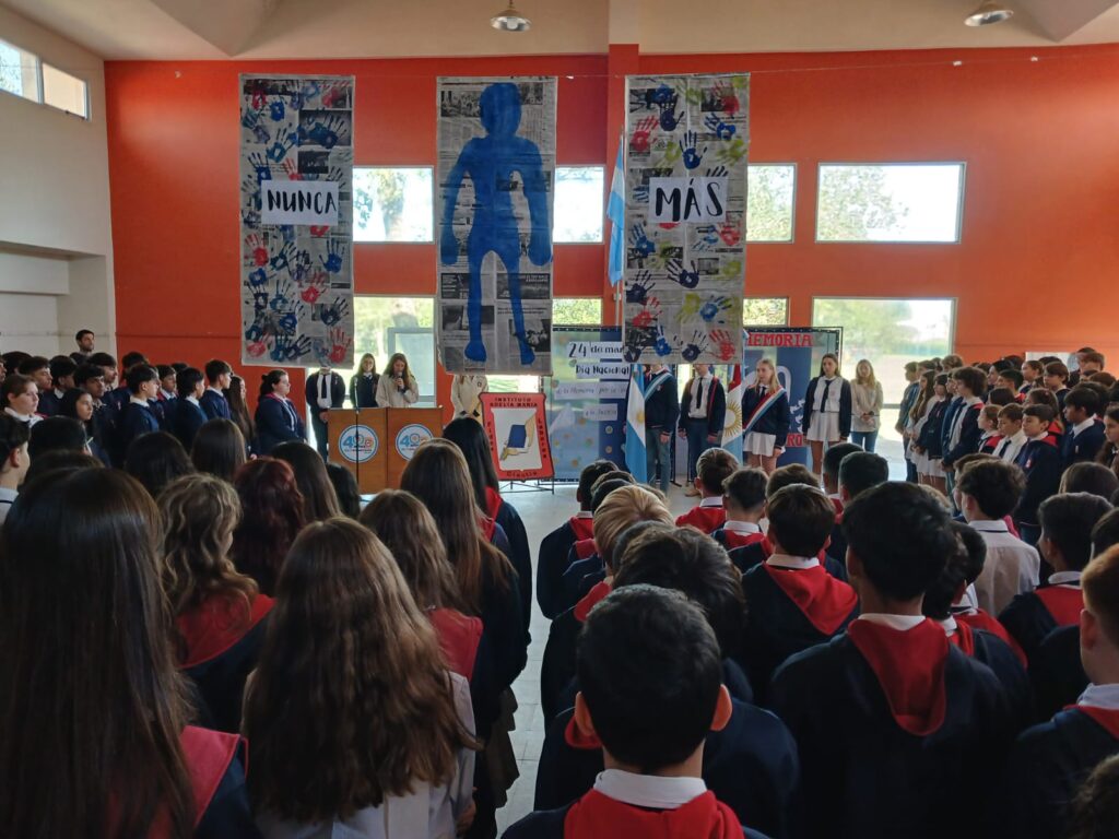 Cabe destacar el involucramiento y compromiso asumido por 6° Año, quienes conjuntamente con las profesoras del Área de Ciencias Sociales, estuvieron a cargo de la organización de la conmemoración. Para ello, elaboraron glosas, investigaron, produjeron y expusieron infografías distribuidas en todo el edificio escolar, promoviendo la reflexión y el análisis crítico del pasado reciente en todos los cursos.