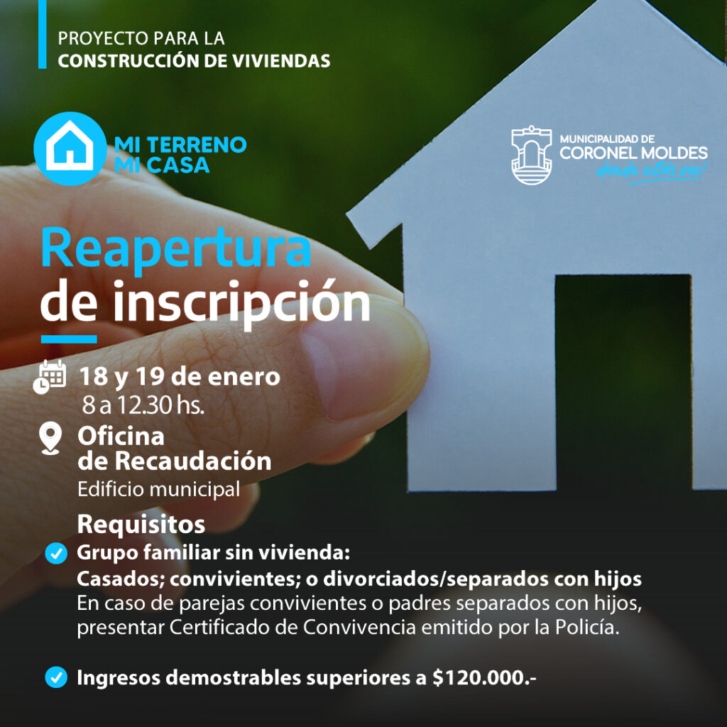 Desde el 18 al 19 de Enero estarán abiertas las inscripciones para el Programa Mi Terreno, Mi Casa de la localidad de Coronel Moldes, desde las 8 hs hasta las 12:30 hs en la Oficina de Recaudación, Edificio Municipal.