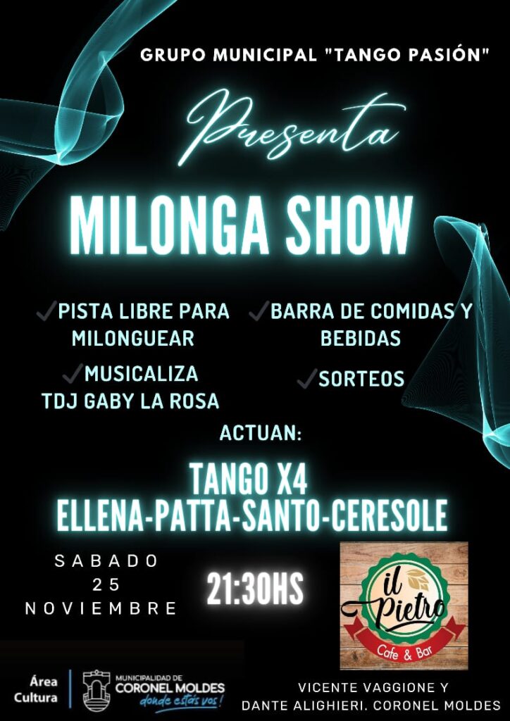 Presentación del grupo «Tango Pasión» este Sábado 25 a partir de las 21:30 hs. El grupo municipal de Coronel Moldes, «Tango Pasión» presenta una noche inolvidable este Sábado 25 de Noviembre a partir de las 21:30 hs.