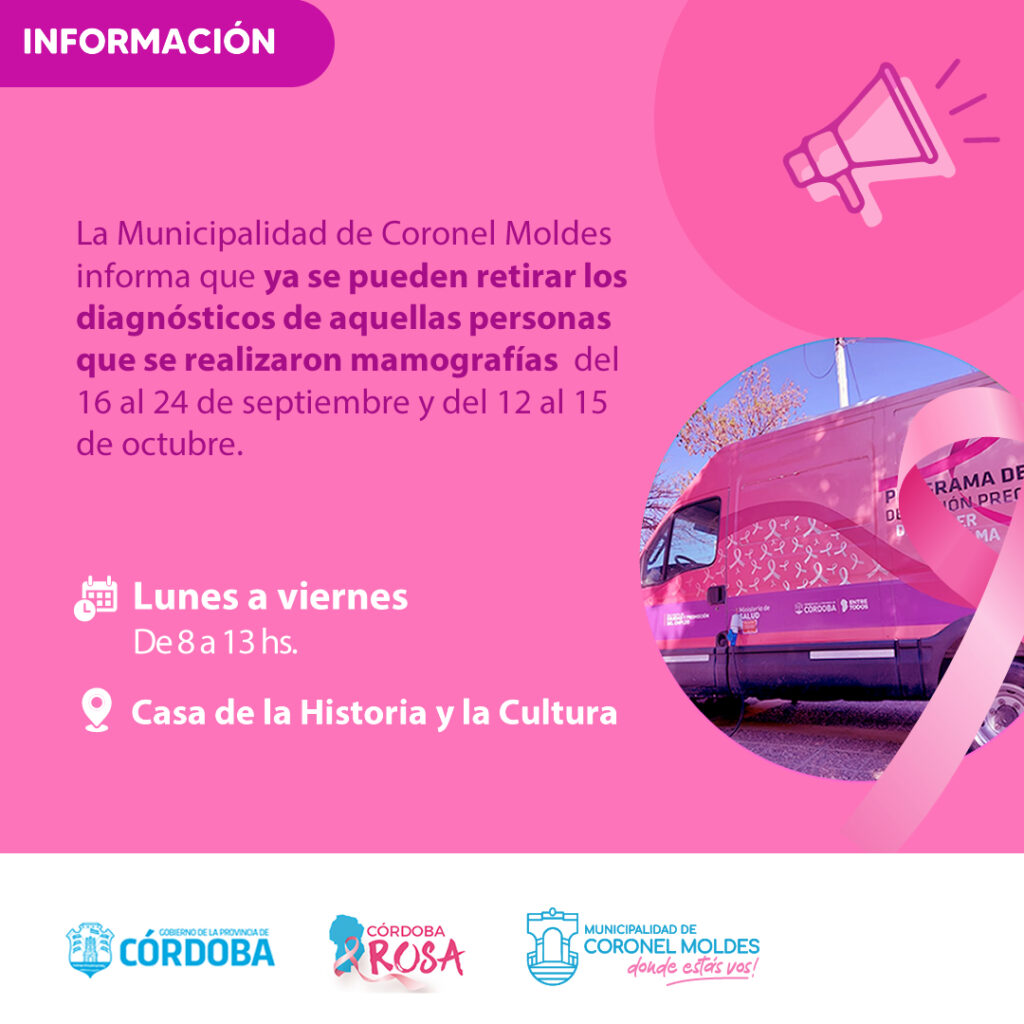 La Municipalidad de Coronel Moldes informa que ya se pueden retirar los diagnósticos de aquellas personas que se realizaron mamografías del 16 al 24 de septiembre y del 12 al 15 de octubre.