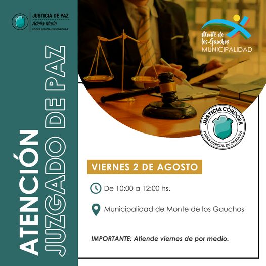 La Municipalidad de Monte de los Gauchos informa que el Juez de Paz Gonzalo Cannizo atenderá el viernes 2 de agosto de 10:00 a 12:00 hs. en las oficinas municipales.