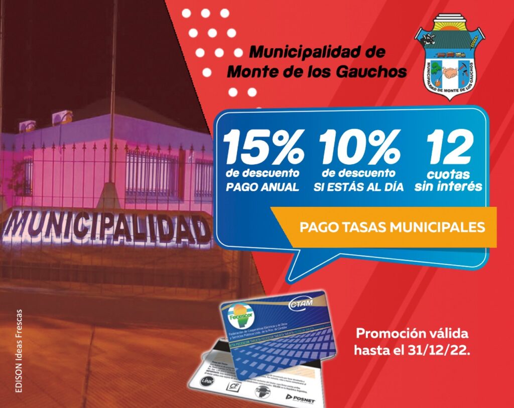 La Municipalidad de Monte de los Gauchos recuerda que el próximo 25 de febrero vence la Tasa a la Propiedad.