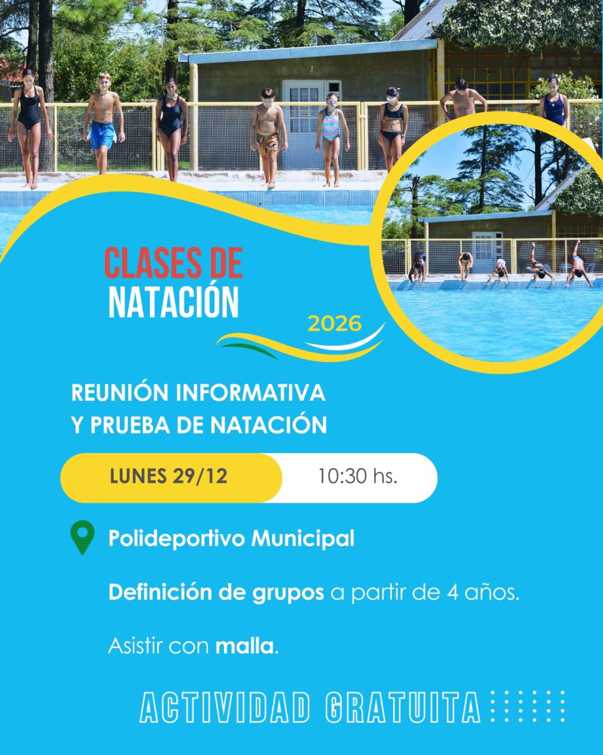 La Municipalidad de Monte de los Gauchos informa que el lunes 29 de diciembre a las 10:30 hs. en el predio polideportivo, se llevará a cabo la reunión informativa y la prueba para las clases gratuitas de natación, a cargo de la Profesora Laurina Bonino.