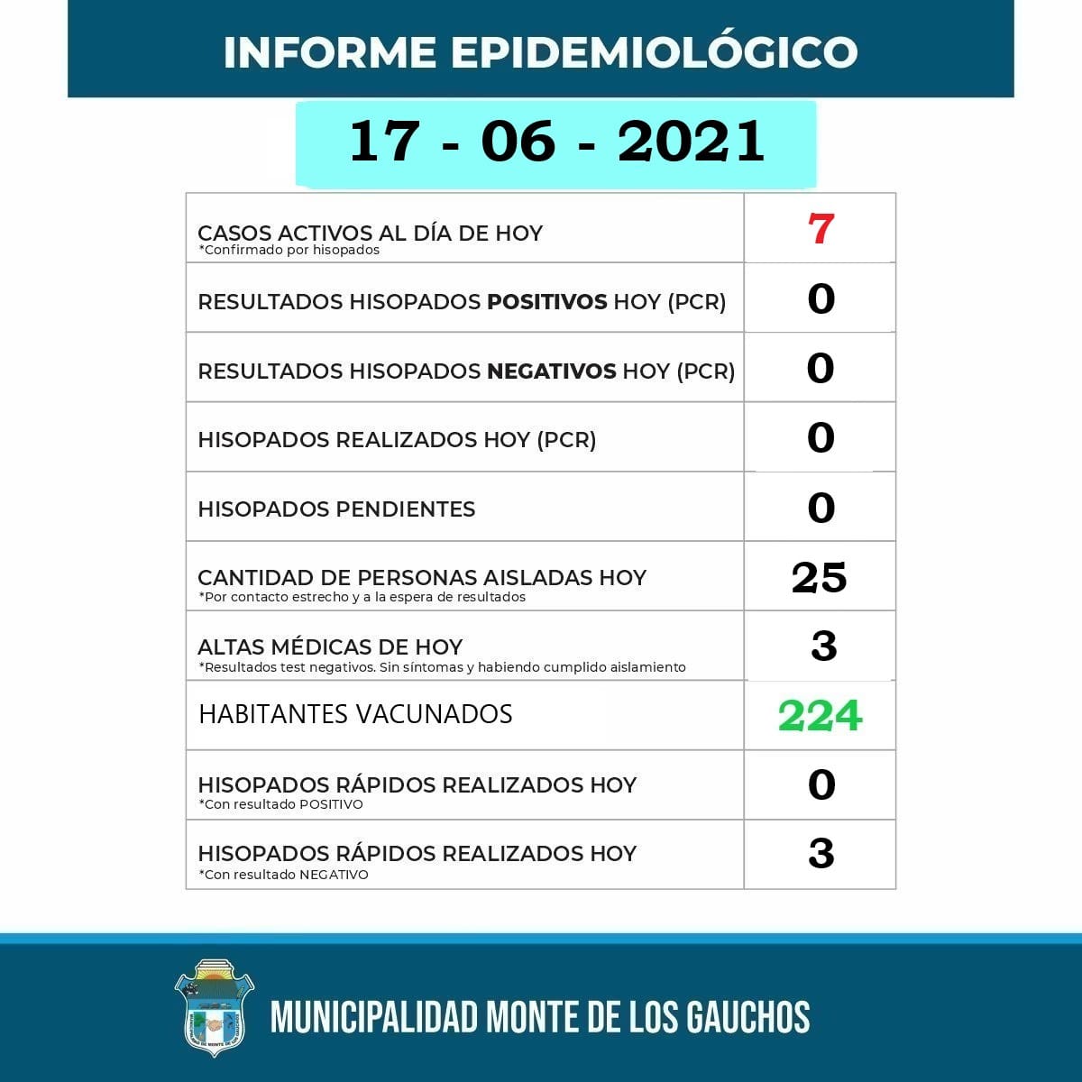 La Municipalidad de Monte de los Gauchos informó que son siete los casos activos de coronavirus en la localidad.