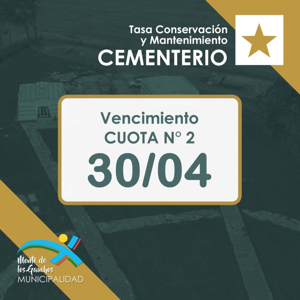 La Municipalidad de Monte de los Gauchos te recuerda que el jueves 30 de abril vence la 2° y última cuota de la Tasa de Conservación y Mantenimiento de Cementerio.
