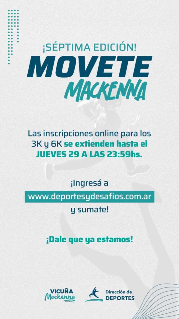 Ya se abrieron las inscripciones para la séptima edición de la carrera más popular del sur de Córdoba, Movete Mackenna. Las inscripciones se realizan de forma online para las distancia de 3K y de 6K y se extenderán hasta el día Jueves 29 de Diciembre a las 23:59 hs.