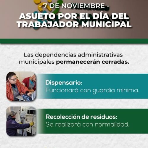 3 noviembre, 2025Este viernes 7 de noviembre habrá asueto para reconocer y celebrar el compromiso de quienes trabajan día a día por nuestra comunidad. Gracias por su dedicación y servicio. Se mantendrán […]