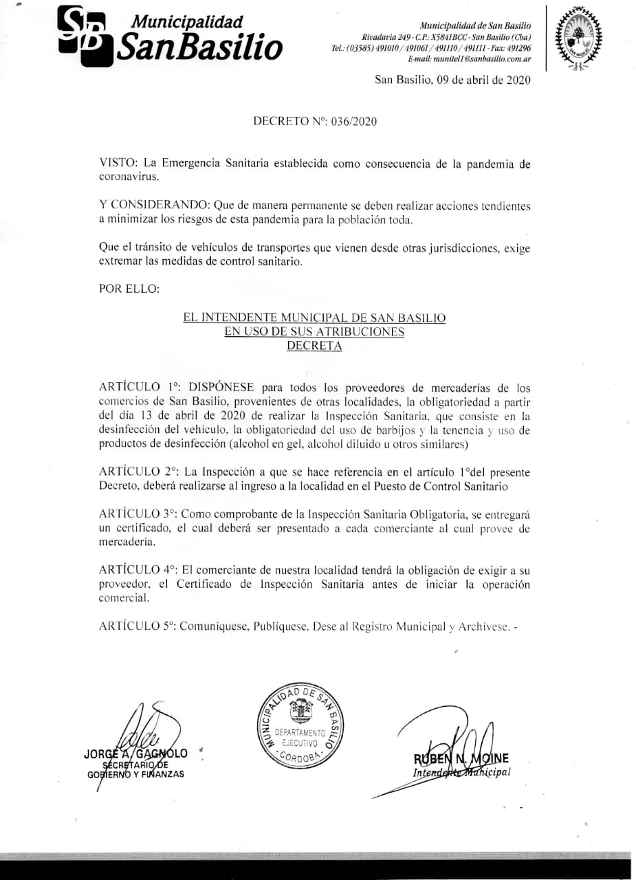 El intendente municipal, Rubén Moine emitió un nuevo decreto que aumenta los controles en los ingresos a la localidad. Prevé que todos los proveedores que ingresen a San Basilio provenientes de otras localidades deberán contar con la Inspección Sanitaria.