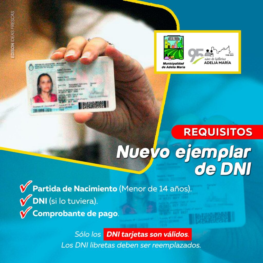 El DNI tarjeta es el único documento válido para identificarte como argentino o extranjero residente en Argentina. Si tienes una libreta de DNI o si tu DNI tarjeta está vencido, dañado, perdido o robado, podes solicitar un nuevo ejemplar en la Oficina del Registro Civil de la Municipalidad de Adelia María. Para hacer el trámite, necesitas presentar los siguientes requisitos: