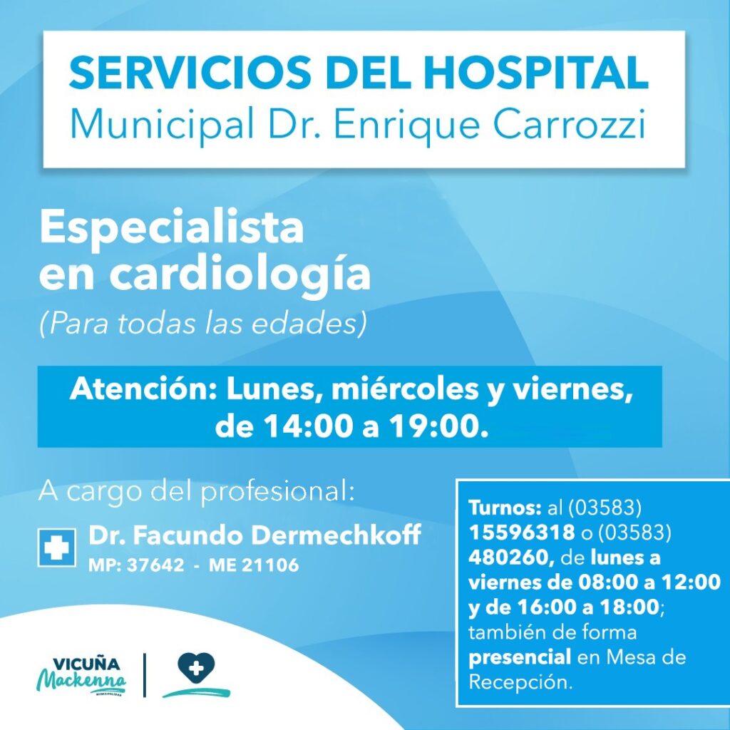 El Dr. Facundo Dermechkoff (MP: 37642 / ME: 21106), Especialista en cardiología atenderá en el Nuevo Hospital Dr. Enrique Carrozzi de la localidad de Vicuña Mackenna.