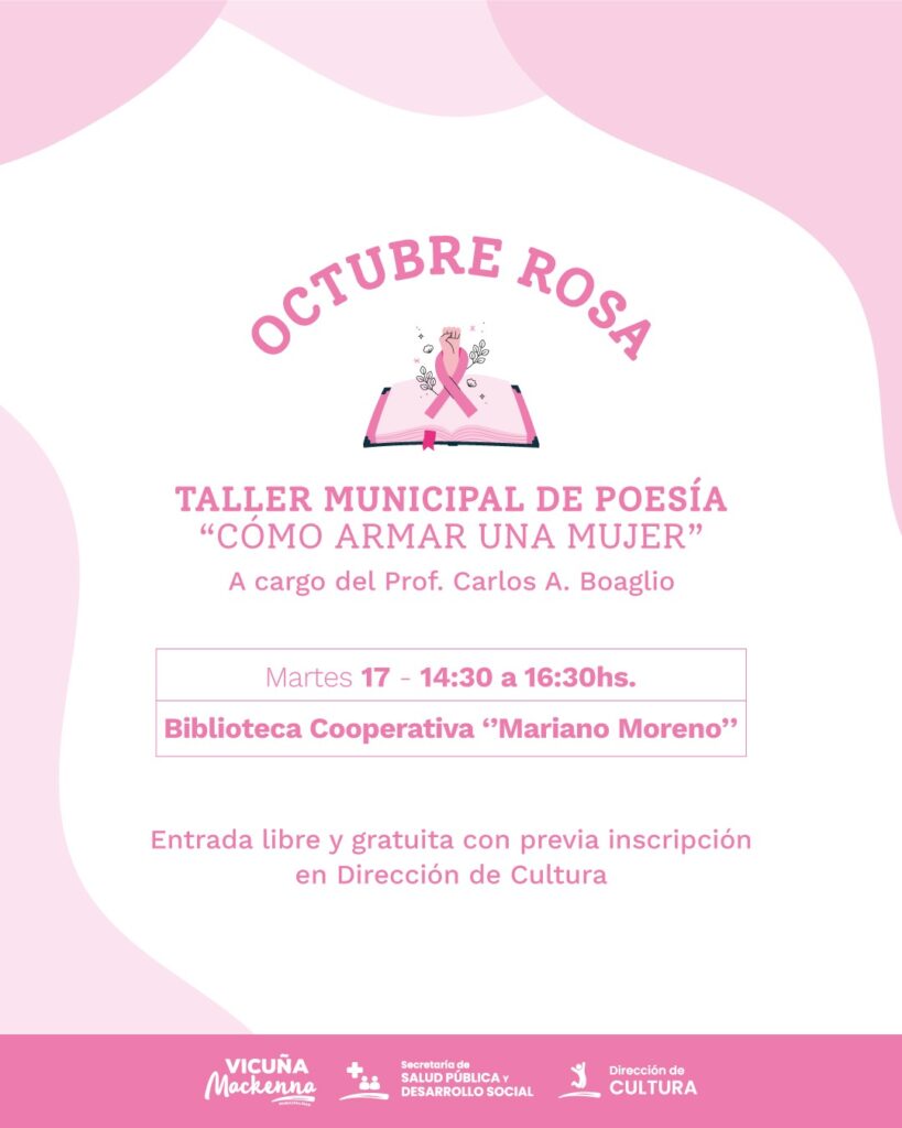 En el mes de la prevención del cáncer de mama, el Taller Municipal de poesía de Vicuña Mackenna invita a participar del encuentro “CÓMO ARMAR UNA MUJER”, a cargo del Prof. Carlos A. Boaglio.