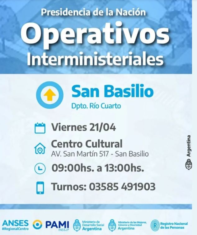 El Viernes 21 de Abril de 9 a 13 hs se realizará un operativo interministerial de la Nación en San Basilio, en donde los vecinos de la localidad podrán realizar diversos trámites administrativos o consultas.