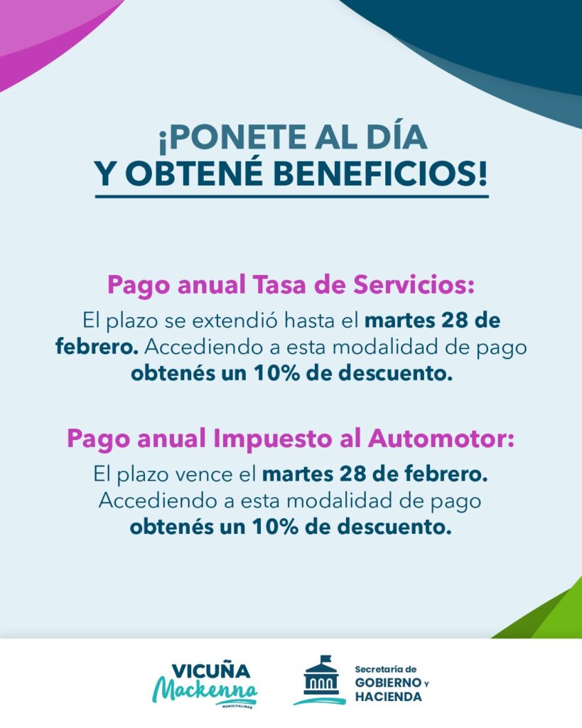 Vence el pago anual de la Tasa de Servicio en la localidad de Vicuña Mackenna, la Municipalidad extendió el plazo de vencimiento de dicho impuesto hasta el día 28 de Febrero.