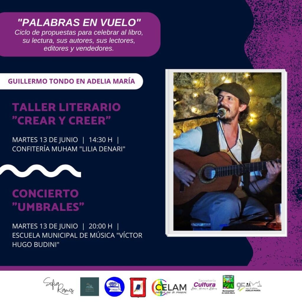 Llega a Adelia María, Guillermo Tondo, un cantautor que brindará un Taller Literario y un concierto en el marco del ciclo cultural Palabras en Vuelo.