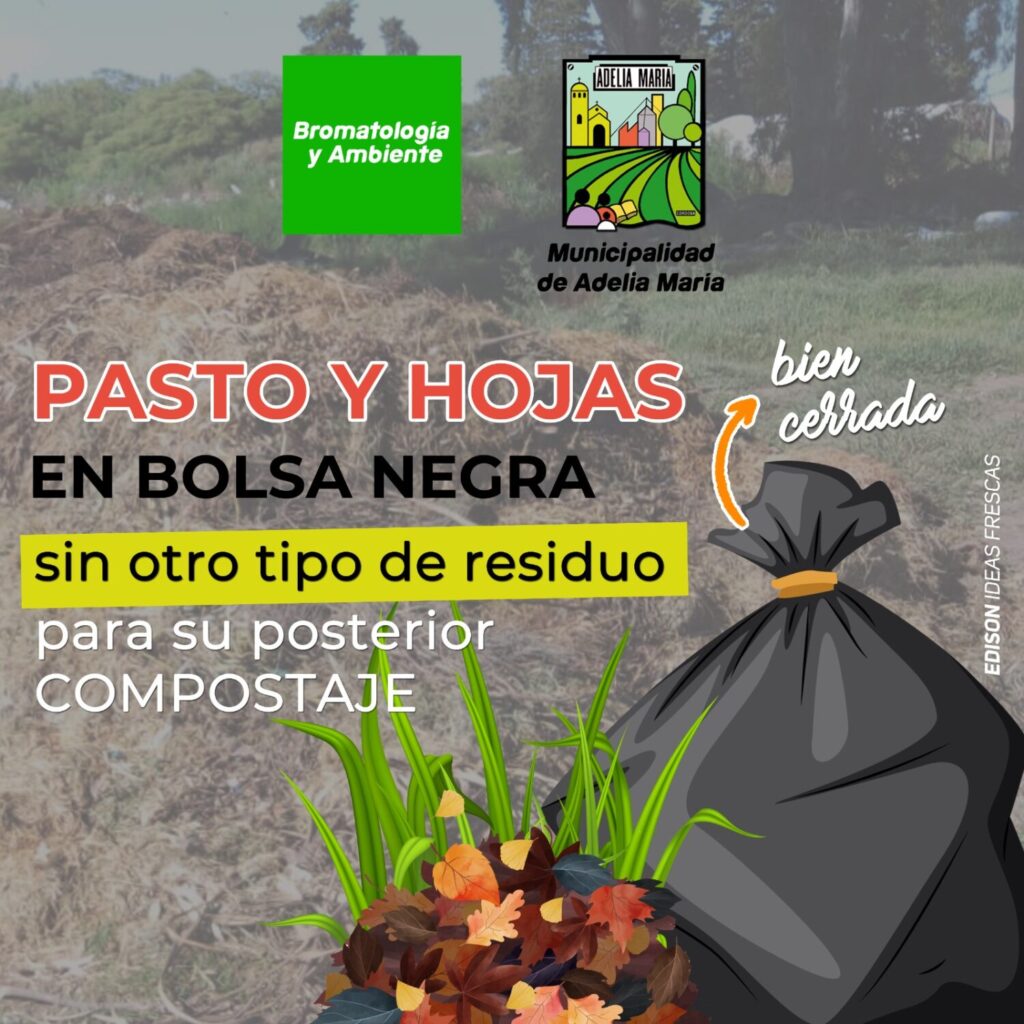 La Municipalidad de Adelia María solicita a los vecinos colocar el pasto y las hojas secas recolectadas en bolsas negras bien cerradas para su posterior compostaje.