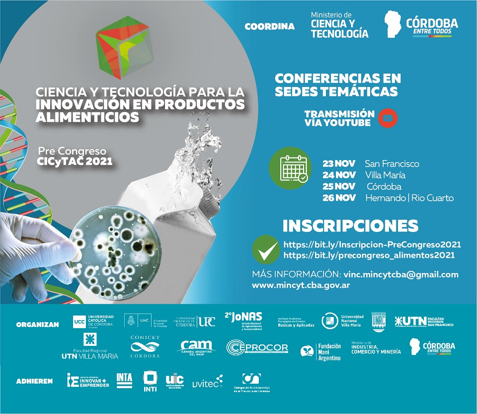 En el marco del programa Ciencia y Tecnología para la Innovación en Productos Alimenticios (CyTiAL), desde el Ministerio de Ciencia y Tecnología. en conjunto con el sector de manufactura de alimentos y bebidas. se organiza el Pre Congreso Internacional de Ciencia y Tecnología de los Alimentos (CICyTAC) 2021.