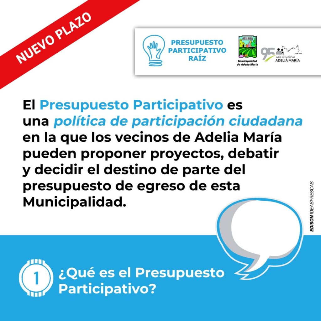 La Municipalidad de Adelia María recuerda a todos los vecinos, que restan los últimos días para la presentación de proyectos del Presupuesto Participativo 2023.