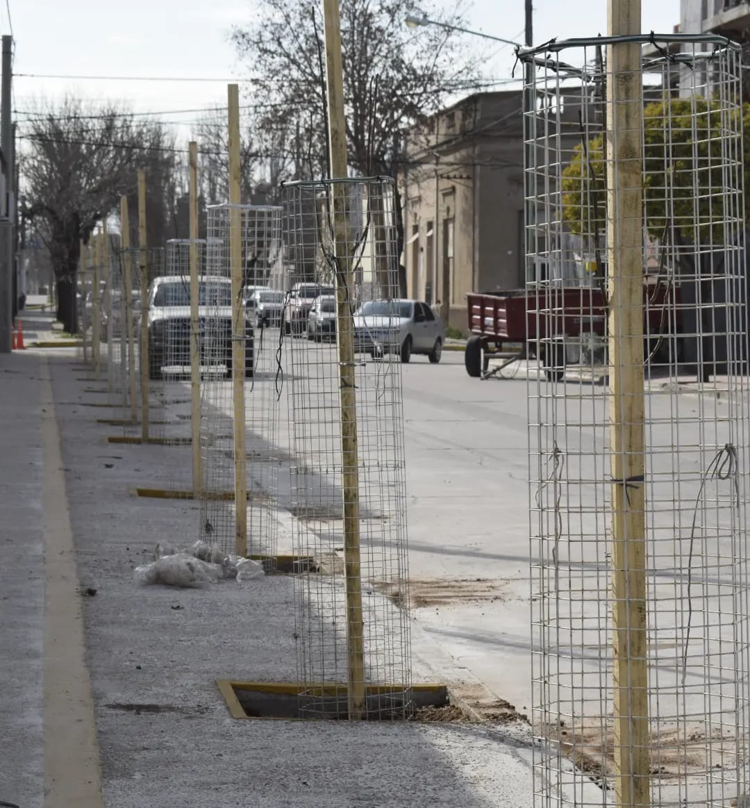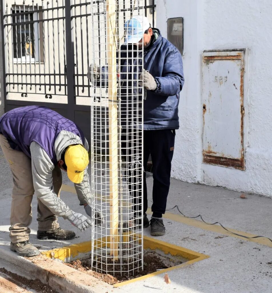 La obra de la nueva vereda del Centro Educativo Nicolás Avellaneda, sobre Vicente Vaggione de Coronel Moldes, avanza con la colocación de Fresnos rojos (Fraxinus angustifoli).