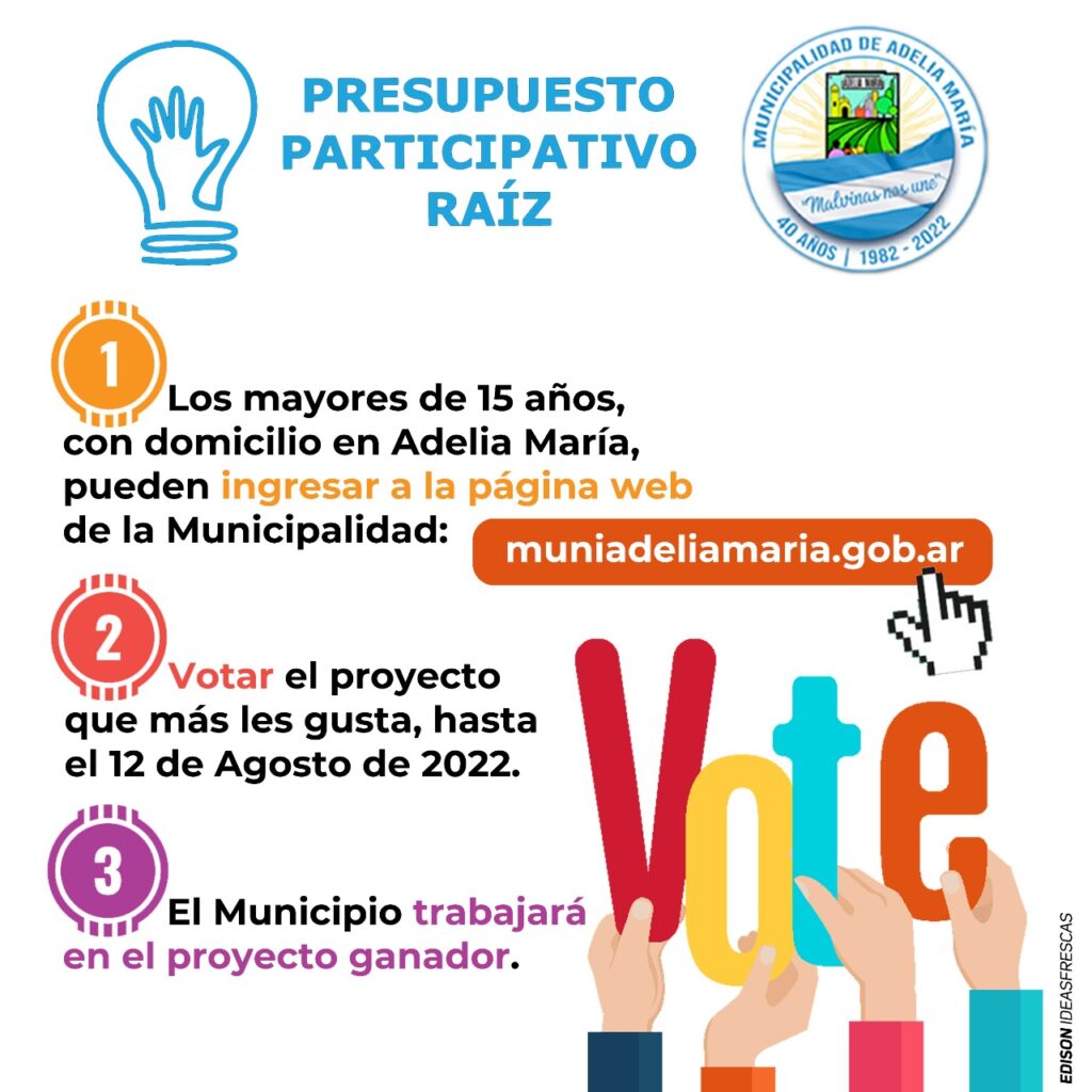 Todas las personas mayores de 15 años, que tengan domicilio en Adelia María, pueden votar el proyecto que más les guste, tienen tiempo hasta este Viernes 12 de Agosto.