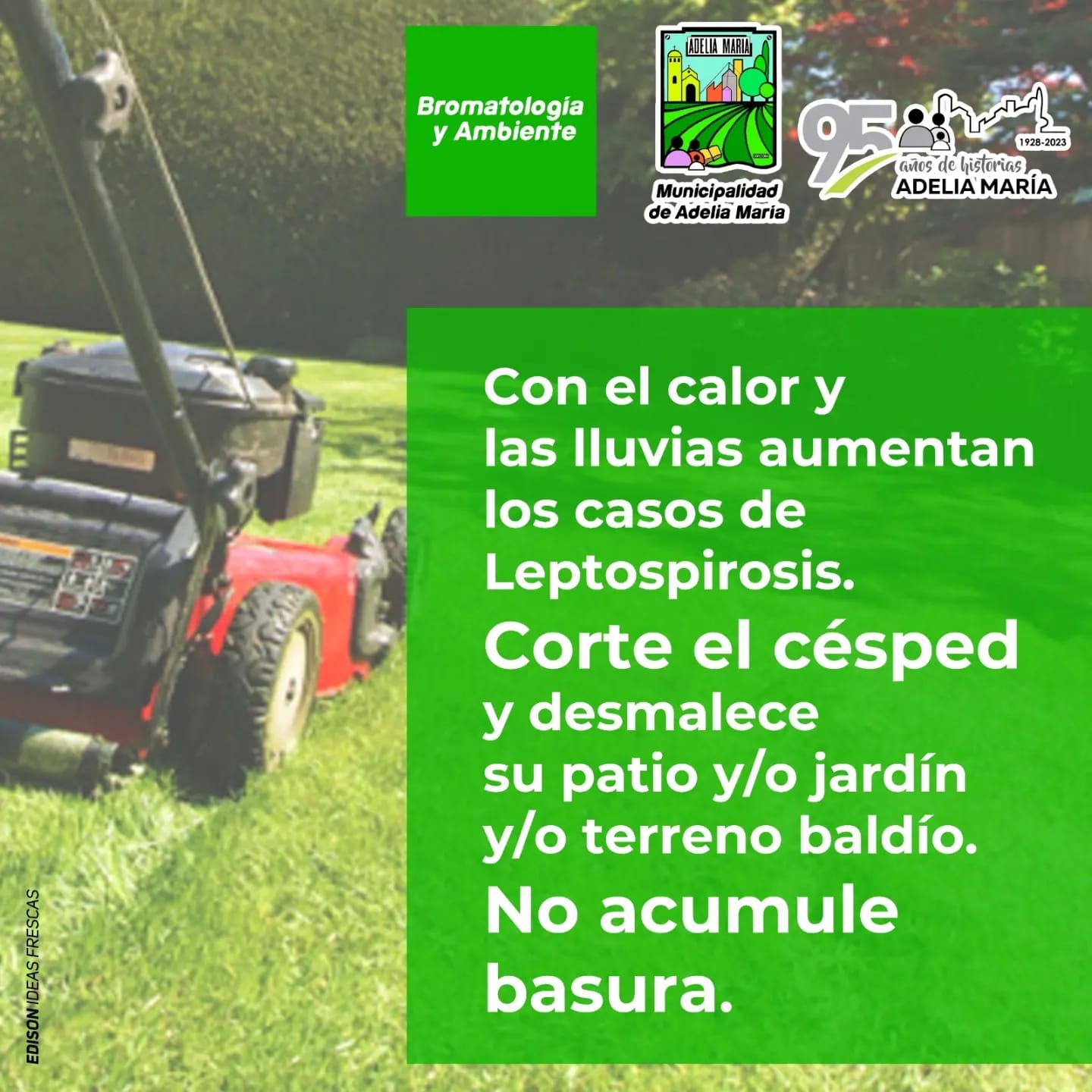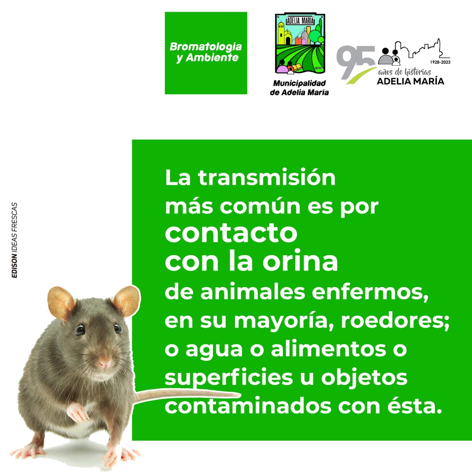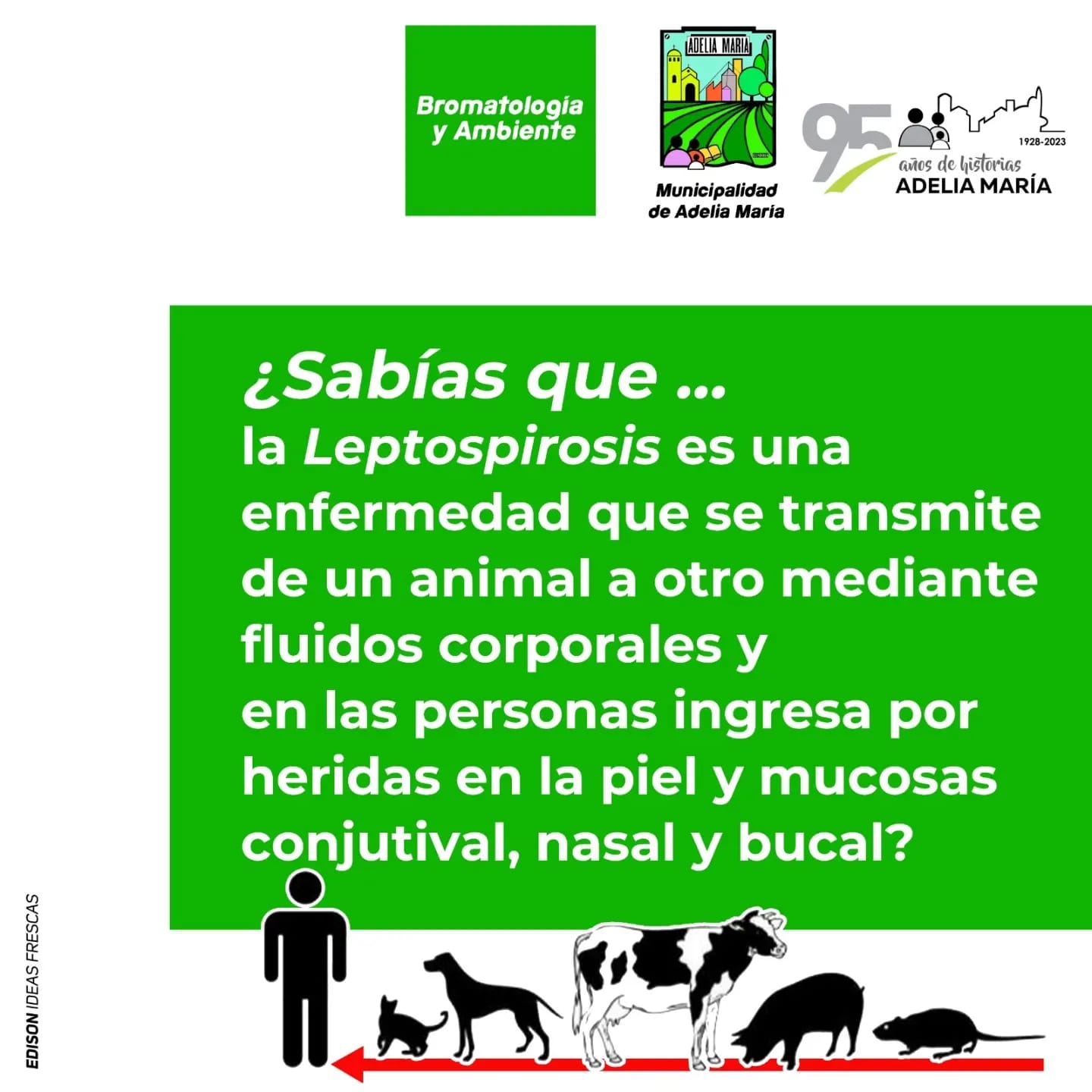 El Área de Bromatología de la Municipalidad de Adelia María publicó una campaña para la prevención, detección temprano y notificación inmediata de la Leptospirosis. La Leptospirosis es una enfermedad que aparece mayormente en épocas de calor, por ello la importancia de estar bien informado y saber que hacer en caso de contraerla.