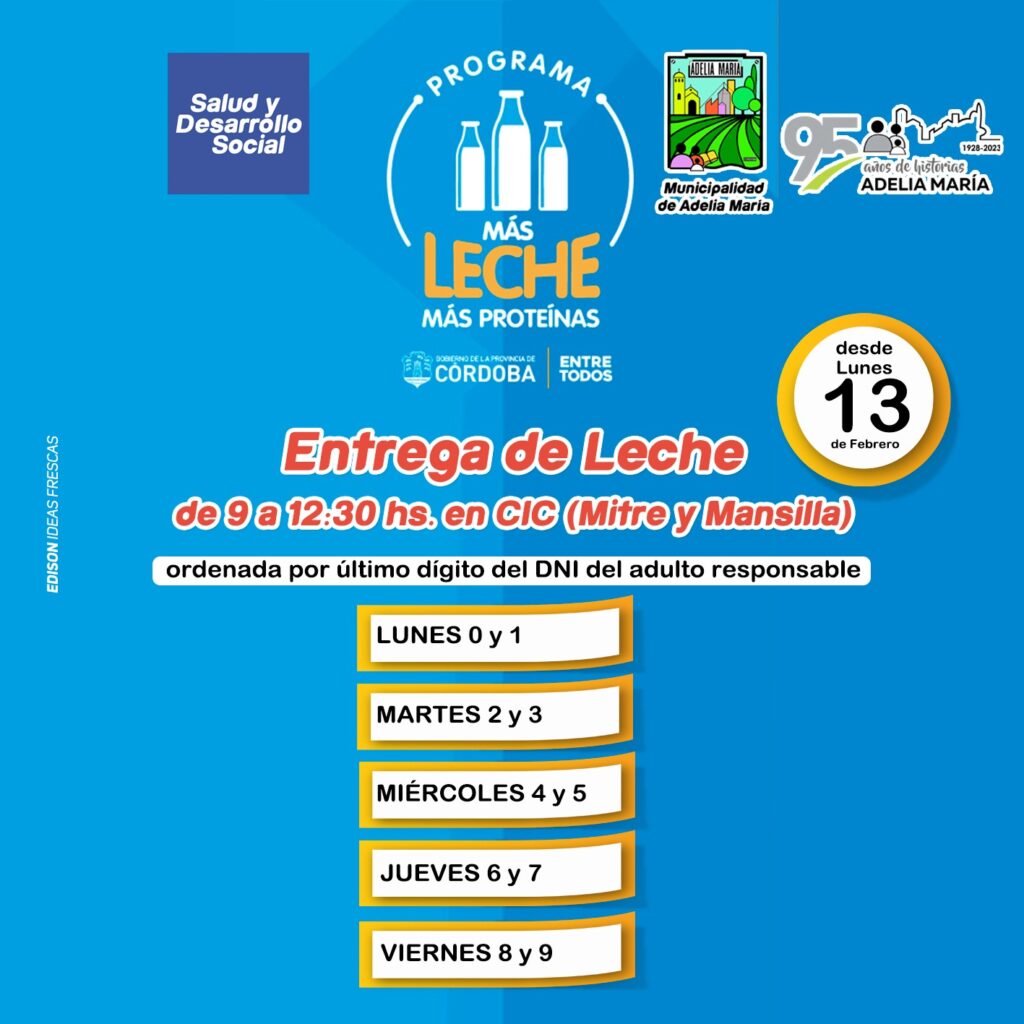 El Área de Salud y Desarrollo Social de la Municipalidad de Adelia María informó los días en los que se realizará la entrega de leche a niños de 4 a 12 años inclusive a partir de esta semana del mes de Febrero, pertenecientes al Programa «Más leche, más proteínas».