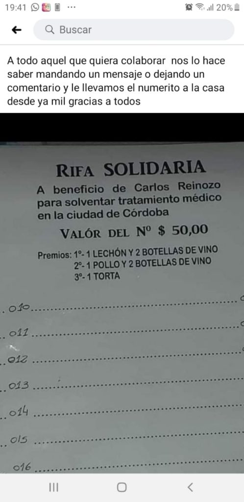 Familiares y allegados a Carlos Reinozo organizaron una rifa solidaria para juntar fondos para que pueda afrontar un tratamiento médico en la ciudad de Córdoba.