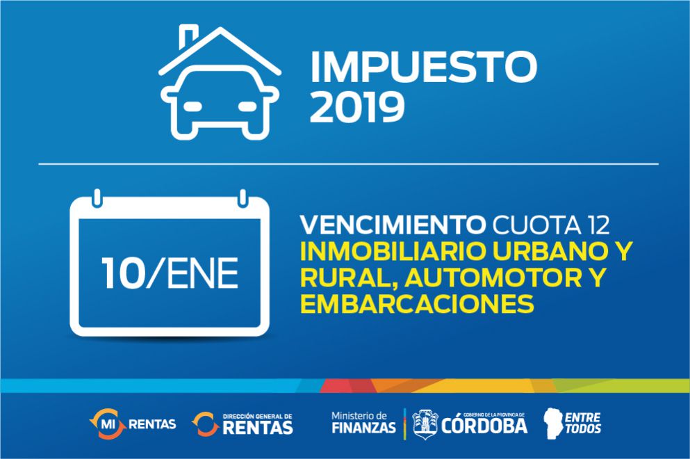 Rentas recuerda que el próximo viernes 10 de enero vence la cuota 12 de los impuestos provinciales: Inmobiliario Urbano y Rural, Automotor y Embarcaciones correspondientes al año 2019.