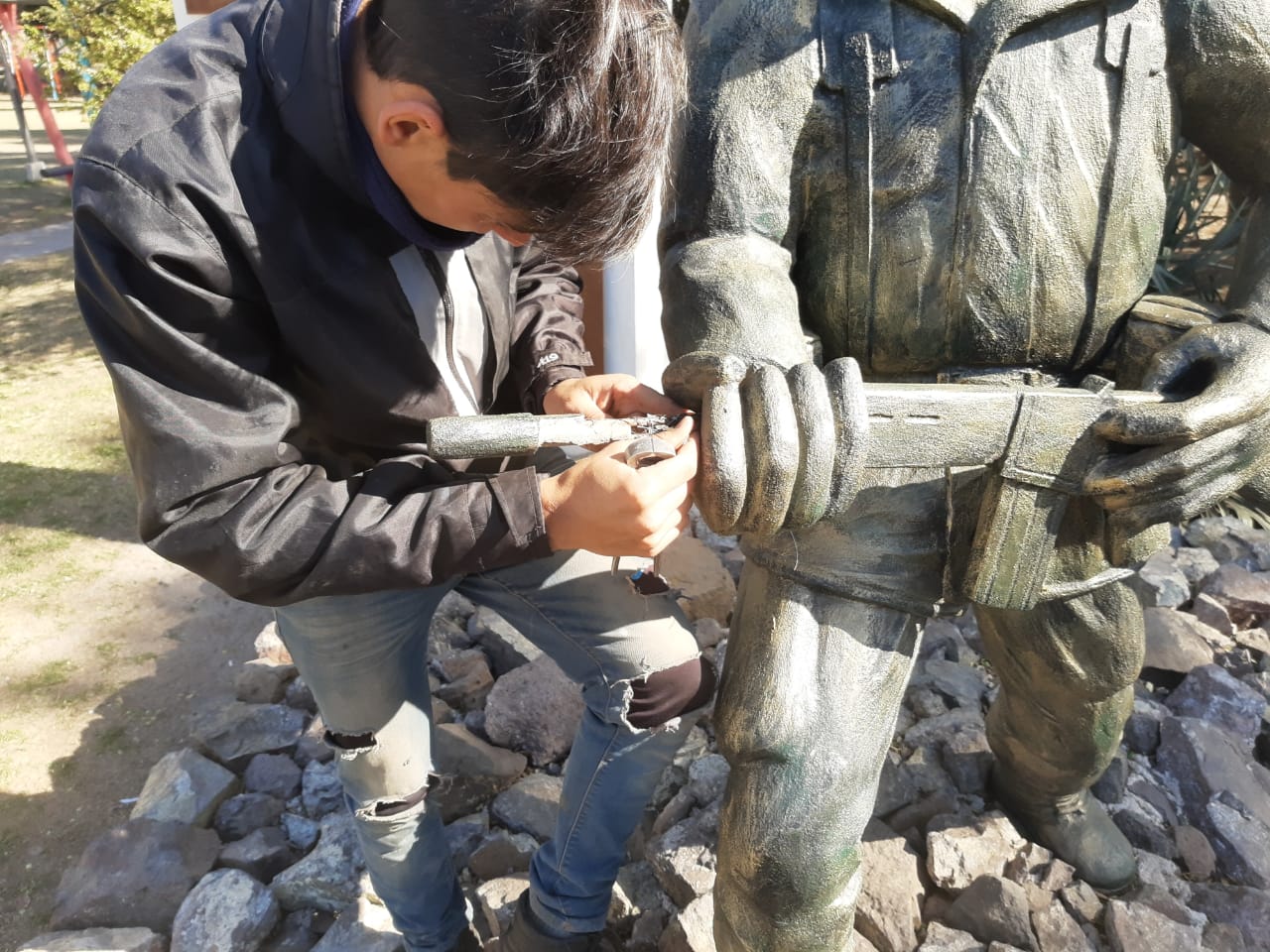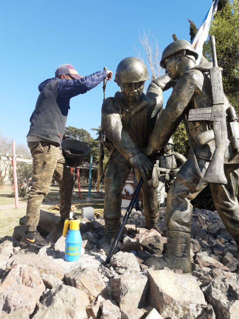 El escultor Marcelo Cuello de la localidad cordobesa de Villa Ascasubi, está reparando las esculturas del monumento de los Héroes de Malvinas, por los daños sufridos por vandalismo, el pasado 14 de agosto.