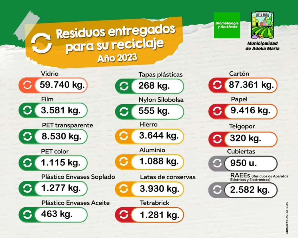 El Área de Ambiente de la Municipalidad de Adelia María presenta el informe anual de los residuos secos reciclados durante el año 2023.