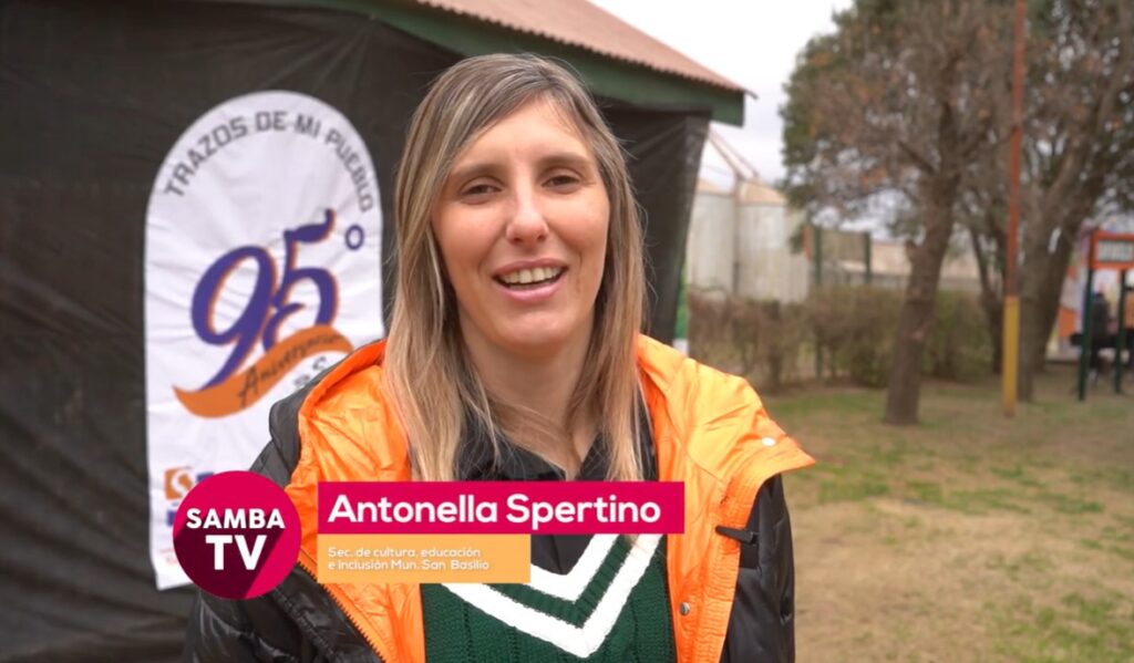 Samba Tv estuvo presente en el acto conmemorativo por los 95° Aniversario de San Basilio, en la inauguración del nuevo mural, en cercanías del ferrocarril, «Trazos de mi Pueblo», y dialogó con Antonella Spertino, secretaria de Cultura de la Municipalidad.