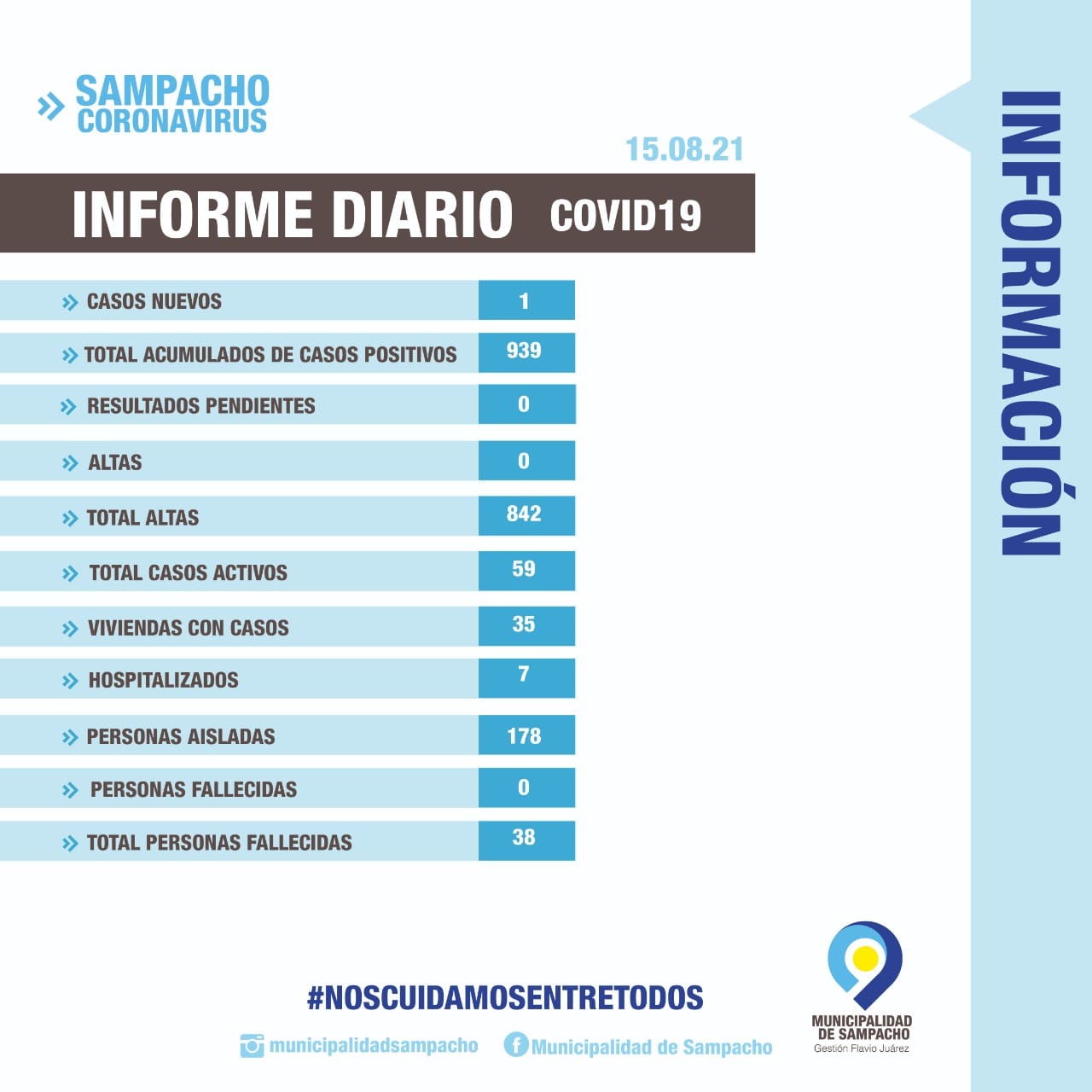 La Municipalidad de Sampacho informó que en la jornada de ayer se registró un nuevo caso positivo de coronavirus.