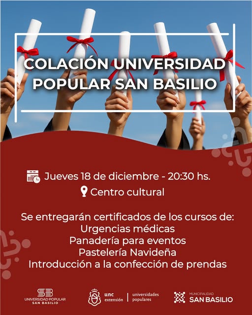 Invitamos a toda la comunidad a ser parte de la colación de la Universidad Popular San Basilio este jueves 18 de diciembre a las 20:30 en el Centro Cultural.