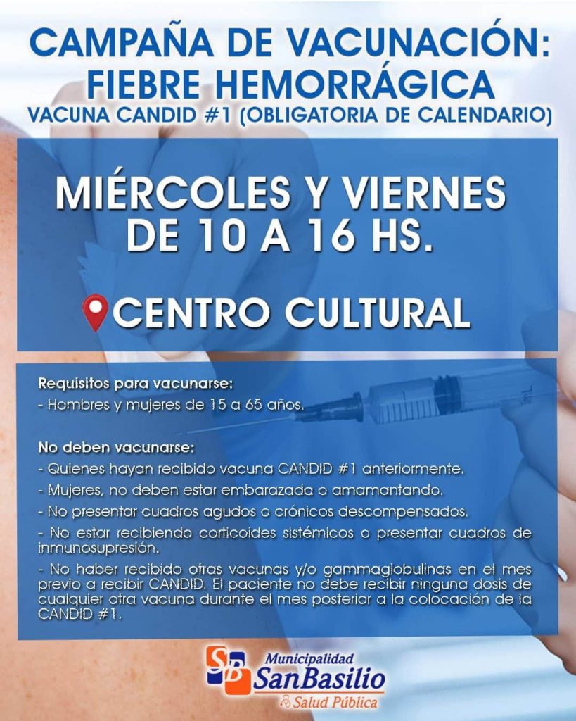 En San Basilio, continúa la campaña de vacunación contra la fiebre hemorrágica. Se realiza los días miércoles y viernes de 10 a 16, en las instalaciones del Centro Cultural.