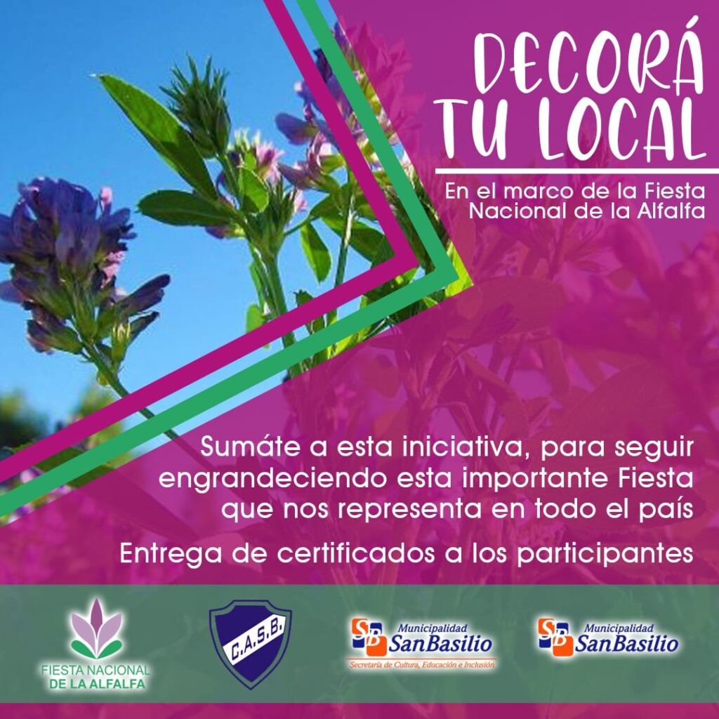 La Municipalidad de San Basilio, invita a todos los ciudadanos de la localidad, a decorar sus locales en el marco de la 58° Fiesta Nacional de la Alfalfa».