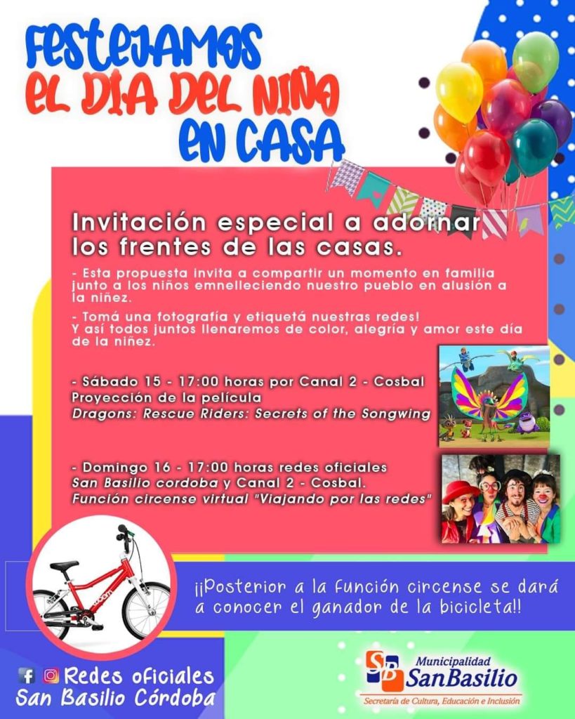 Desde la Secretaría de Cultura, Educación e Inclusión queremos agasajar a todas las niñas y niños de nuestra localidad y zona rural, es por ello que invitamos a todas las familias a compartir un momento decorando los frentes de sus casas para festejar con color, alegría y amor este Día del Niño, podes tomar una fotografía y etiquetar nuestras Redes Oficiales.