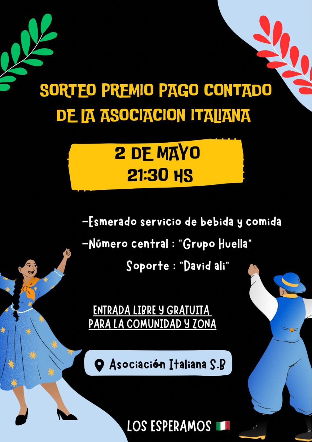 El próximo 2 de mayo se viene la peña bailable en Sociedad Italiana, actuaran la huella y David Ali. Sorteo premio pago contado del bono de Asociación Italiana.