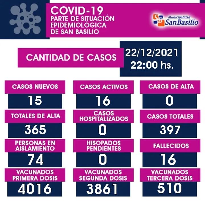 La Municipalidad de San Basilio informó que, en la jornada de ayer, se registraron 15 nuevos casos positivos de coronavirus.
