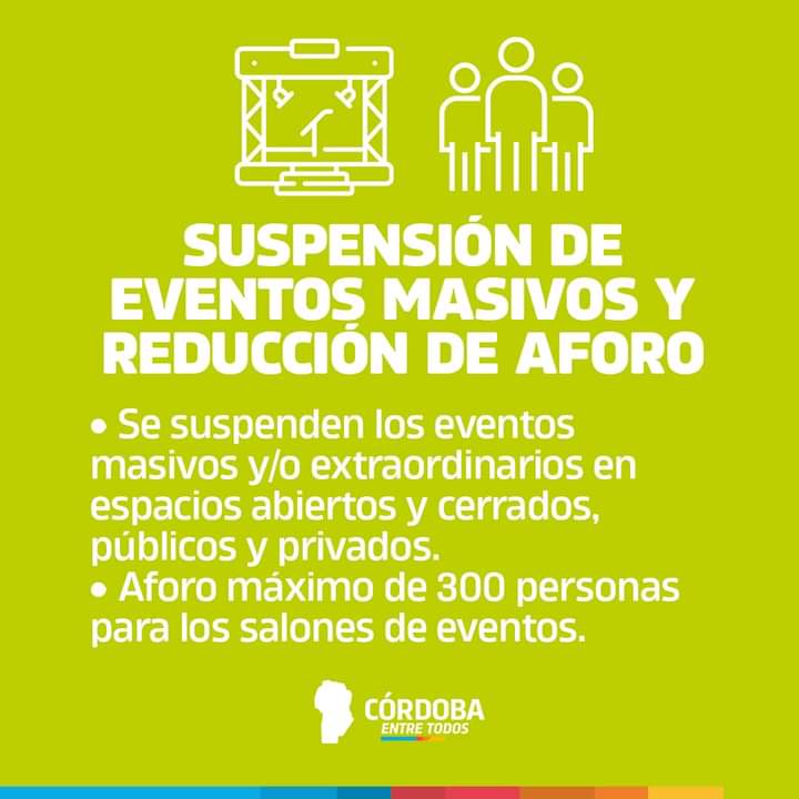 En la Provincia quedarán suspendidos los eventos masivos y/o extraordinarios, tanto en espacios abiertos como cerrados, públicos como privados: recitales, festivales, bailes, discotecas y/o boliches y se establece un aforo máximo de 300 personas para los salones de eventos.