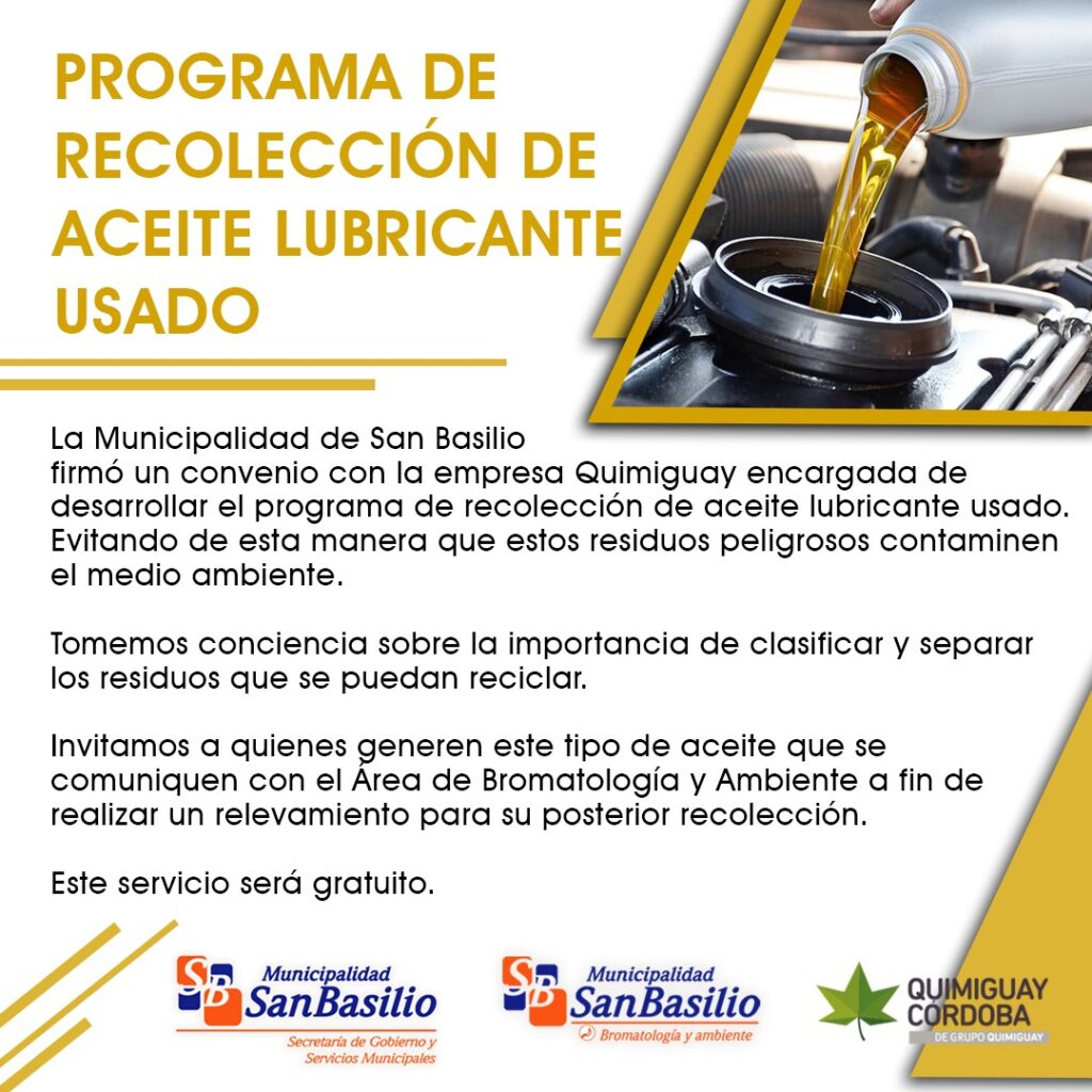 Invitamos a quienes generan este tipo de aceite que se comuniquen con el Área de Bromatología y Ambiente a fin de realizar un relevamiento para su posterior recolección.