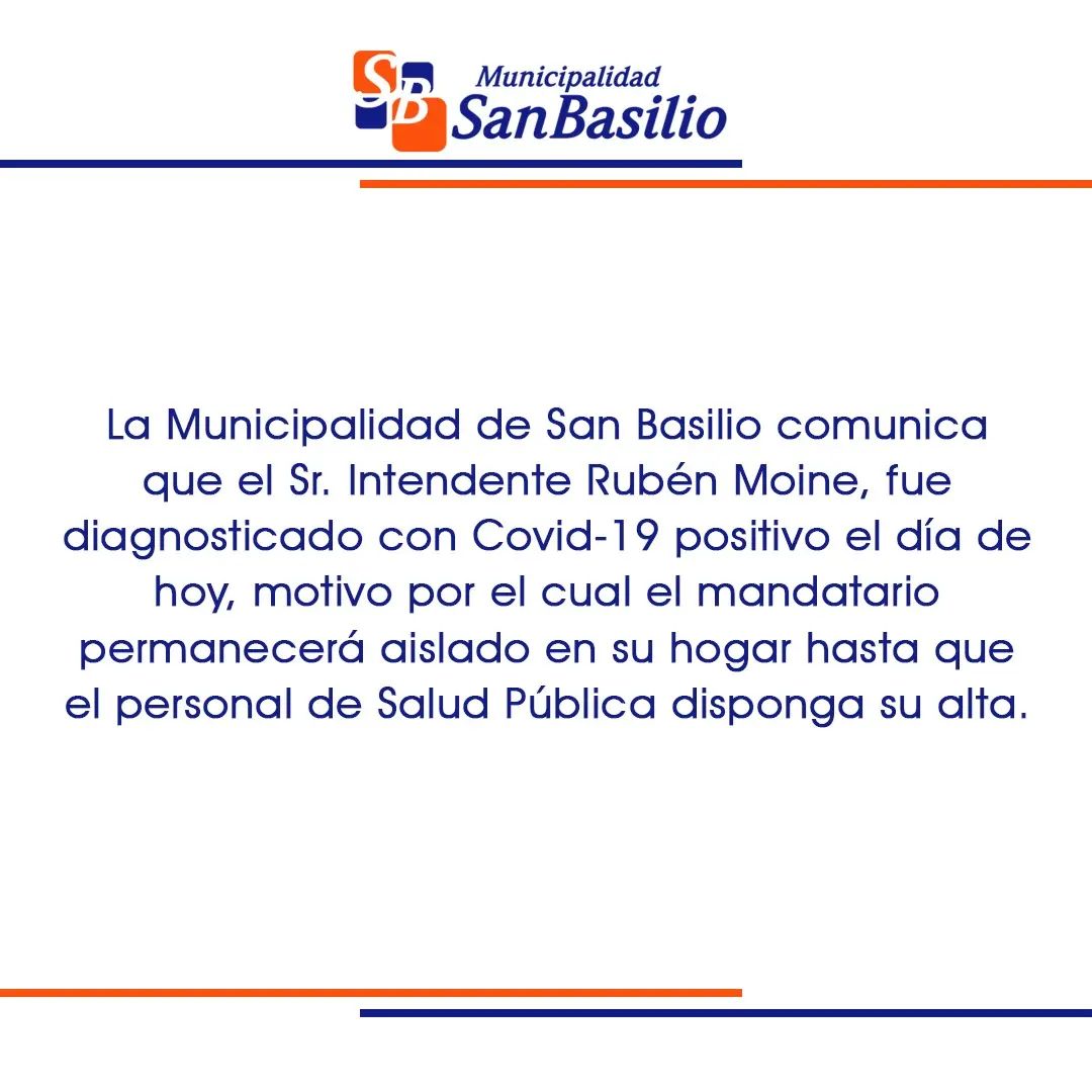 La Municipalidad de San Basilio comunicó a través de las redes sociales que el intendente, Rubén Moine, dio positivo para Covid-19.