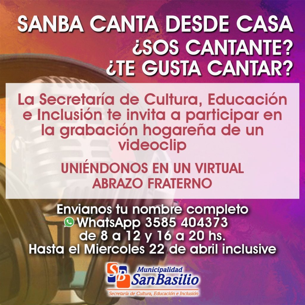 En esta nueva propuesta de la Secretaría de Cultura, Educación e Inclusión de la Municipalidad de San Basilio, invitamos a todas las personas que les guste cantar a participar de la grabación de un videoclip musical desde sus hogares.