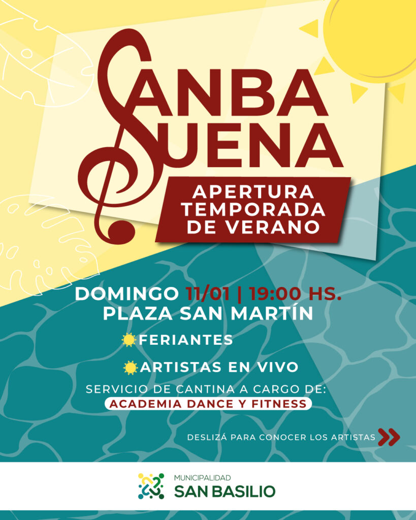 Música, alegría y encuentro para disfrutar en familia y con amigos. El próximo Domingo 11/01 a las 19:00 hs en la Plaza San Martín Vení a disfrutar la tarde Municipalidad de San Basilio – Construyendo Futuro.