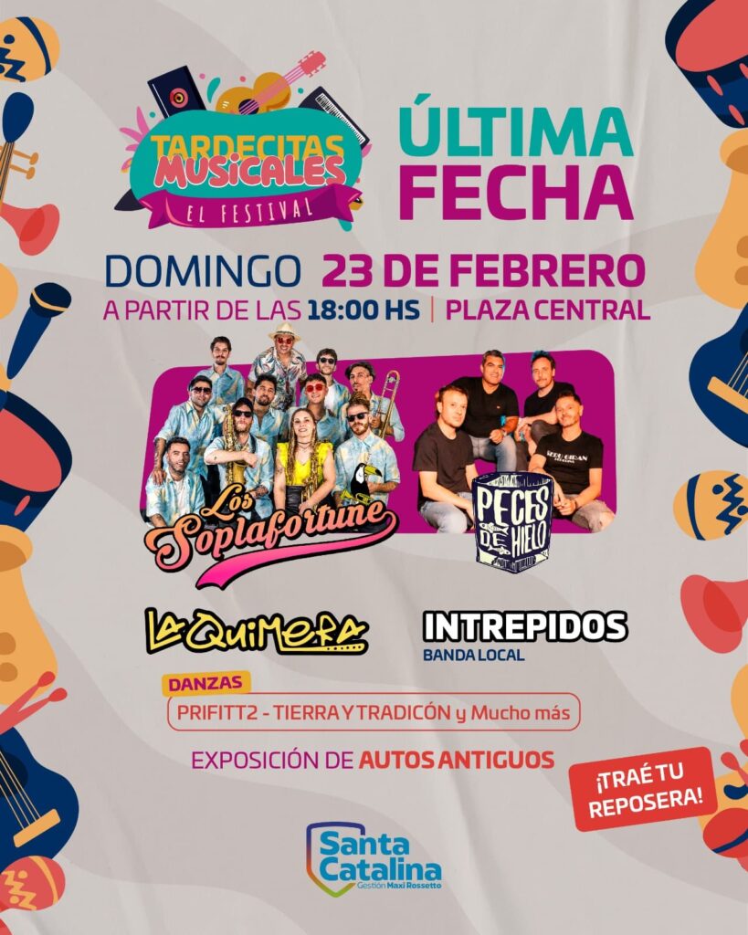 En la última Tardecita se presentarán: Los Soplafortune, Peces de Hielo, La Quimera, Intrépidos (banda local juvenil) y los grupos de danzas PriFitt2, Tierra y Tradición… ¡Y muchas sorpresas más!