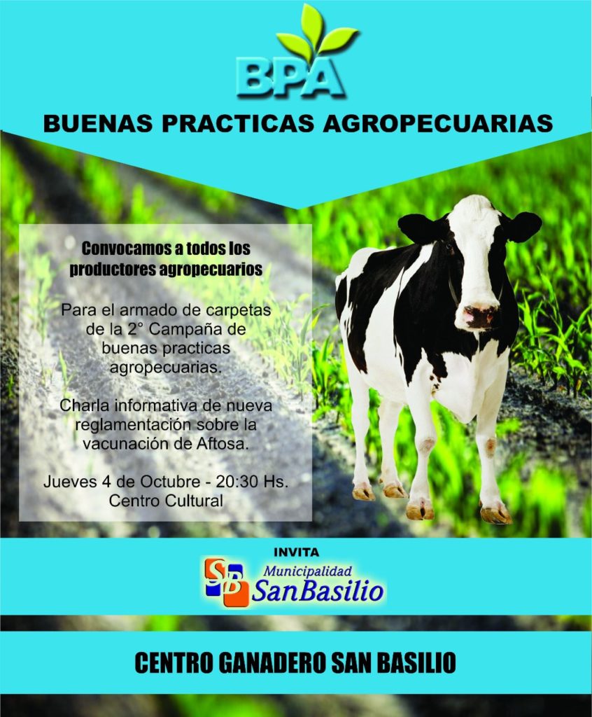 La Municipalidad de San Basilio, a través del Centro Cultural Ganadero, invita a todos los productores a participar de la Segunda Campaña de Buenas Prácticas Agropecuarias el día Jueves 4 de Octubre 20:30hs en el Centro de Cultura Municipal