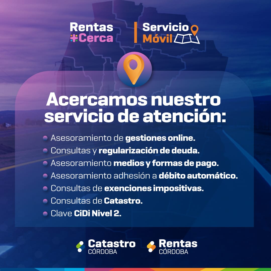 La Municipalidad de Monte de los Gauchos comunica que se desarrollará el Servicio Móvil de Catastro y Rentas Córdoba, el próximo miércoles 14 de mayo, a partir de las 9:00 horas, en el Edificio NIDO, ubicado en Arturo Illia 264.