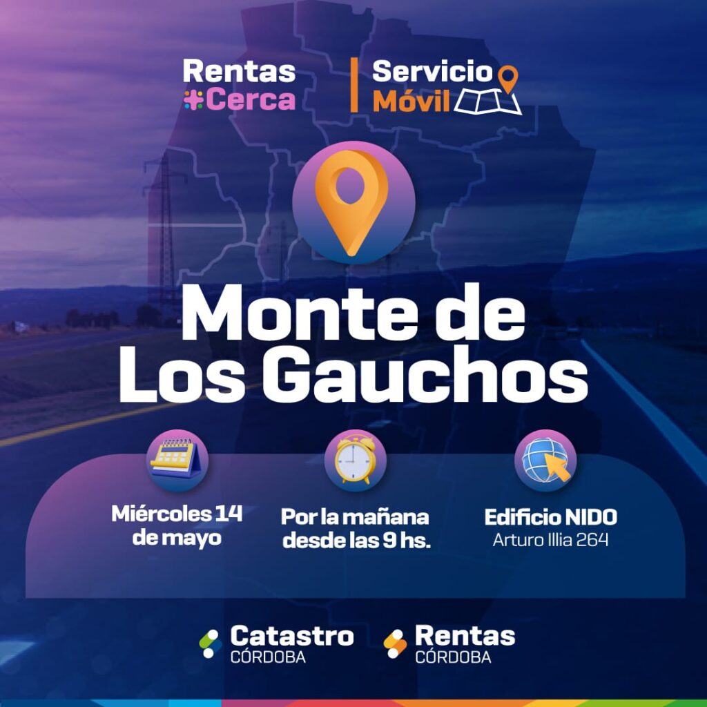 La Municipalidad de Monte de los Gauchos comunica que se desarrollará el Servicio Móvil de Catastro y Rentas Córdoba, el próximo miércoles 14 de mayo, a partir de las 9:00 horas, en el Edificio NIDO, ubicado en Arturo Illia 264.