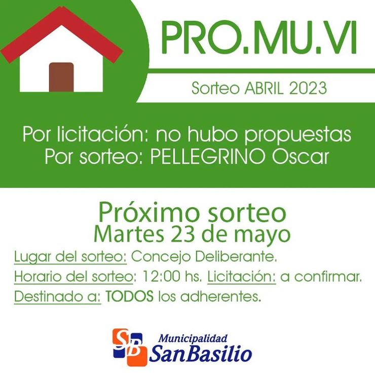 La Municipalidad de San Basilio informa que el día 23 de Mayo se realizará el sorteo del programa de viviendas PRO.MU.VI correspondientes al mes de Marzo 2023.