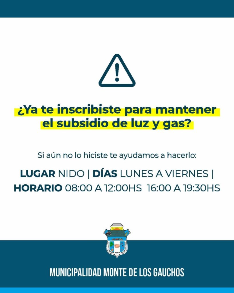Para aquellos vecinos de la localidad de Monte de los Gauchos que todavía no hayan realizado el trámite para recibir el subsidio de Gas y Luz otorgado por el Gobierno Nacional, la Municipalidad ofrece ayudar con la inscripción de dicho trámite.