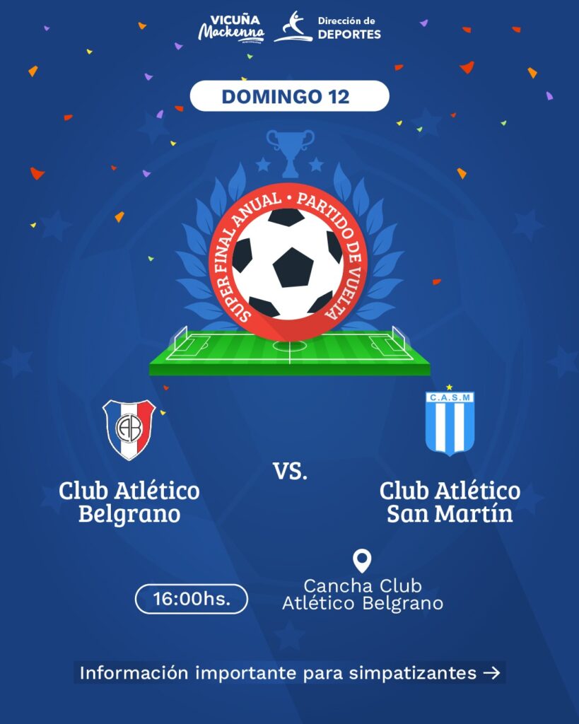 Este Domingo 12 de Noviembre a las 16 hs se disputará la Super Final Anual entre Belgrano y San Martín, la Municipalidad de Vicuña Mackenna publicó algunas recomendaciones.